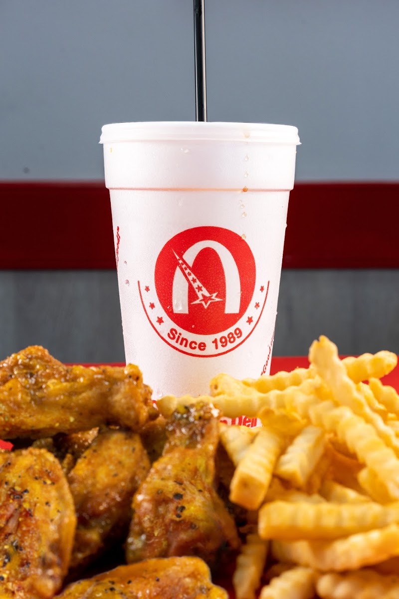 ................................US$0.00Fresh never frozen wings fried to a satisfying crunch and hand tossed in any of our signature American Deli sauces. Served with Fries and a Drink.